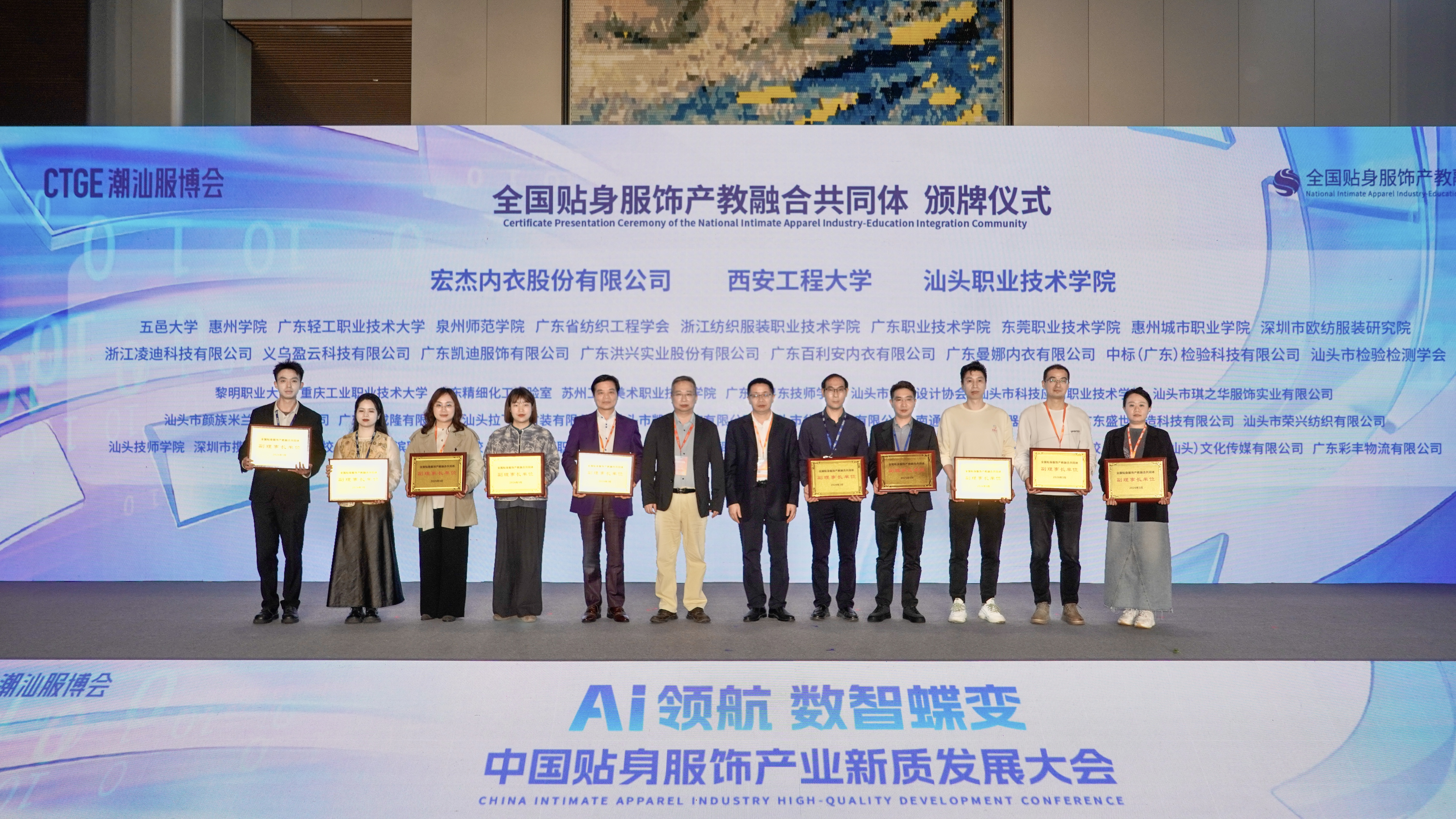 3月18日,全国贴身服饰产教融合共同体(以下简称“共同体”)成立大会暨成员单位授牌仪式在第五届潮汕国际纺织服装博览会期间举行。该共同体由星空彩票了单双四肖、宏杰内衣股份有限公司、西安工程大学联合牵头发起,秘书处常设星空彩票了单双四肖,负责日常运营协调。