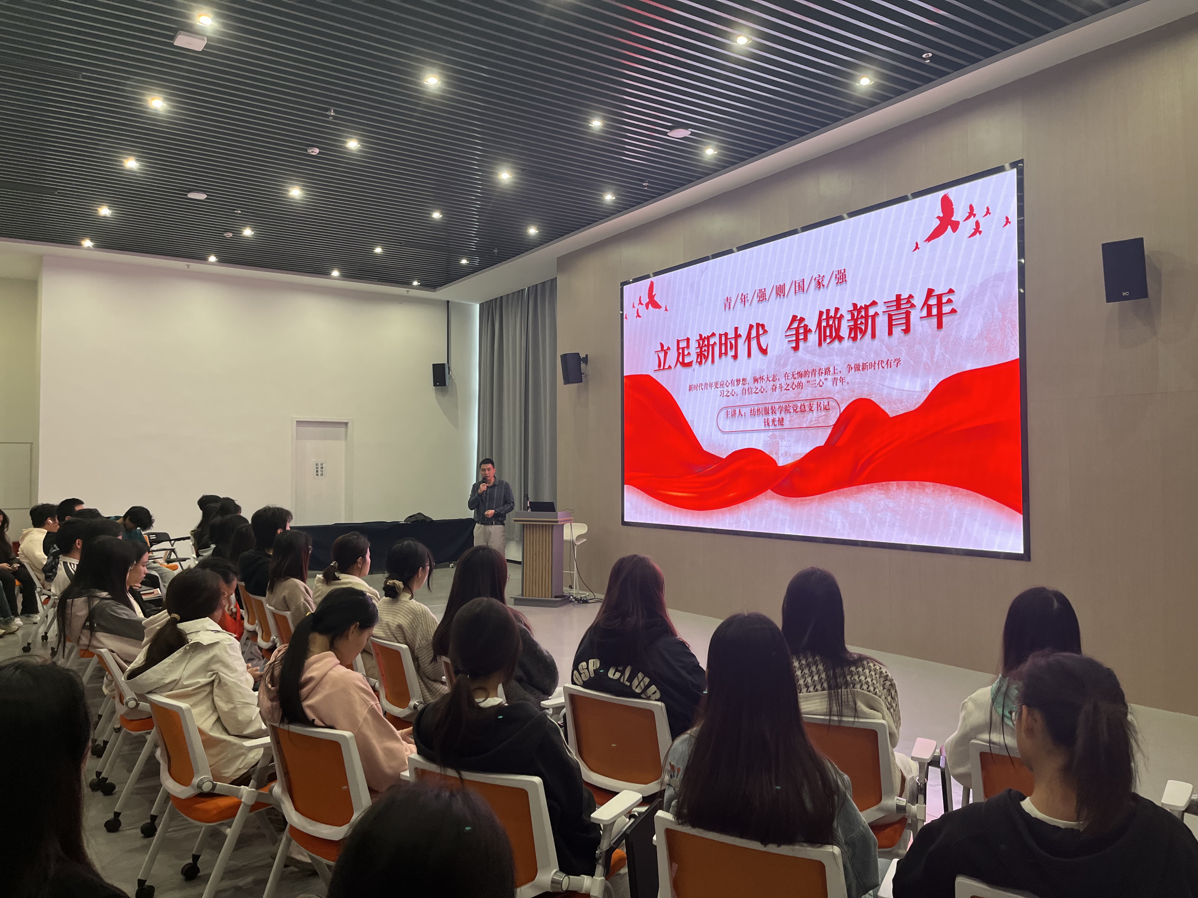 11月27日,纺织服装学院党总支书记钱光健以“立足新时代 争做新青年”为主题,为全体新生带来了一场振奋人心的“开学第一课”。