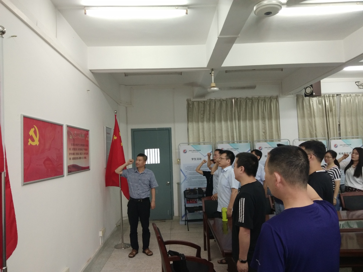 为进一步提升基层党组织的创造力、凝聚力、战斗力,激励广大党员继承和发扬党的优良传统,2019年7月3日,机电工程系第一党支部在系会议室召开“不忘初心,牢记使命”主题党日党员会议,为7月份入党的党员同志过政治生日,举行重温誓词活动,唤醒入党初心。