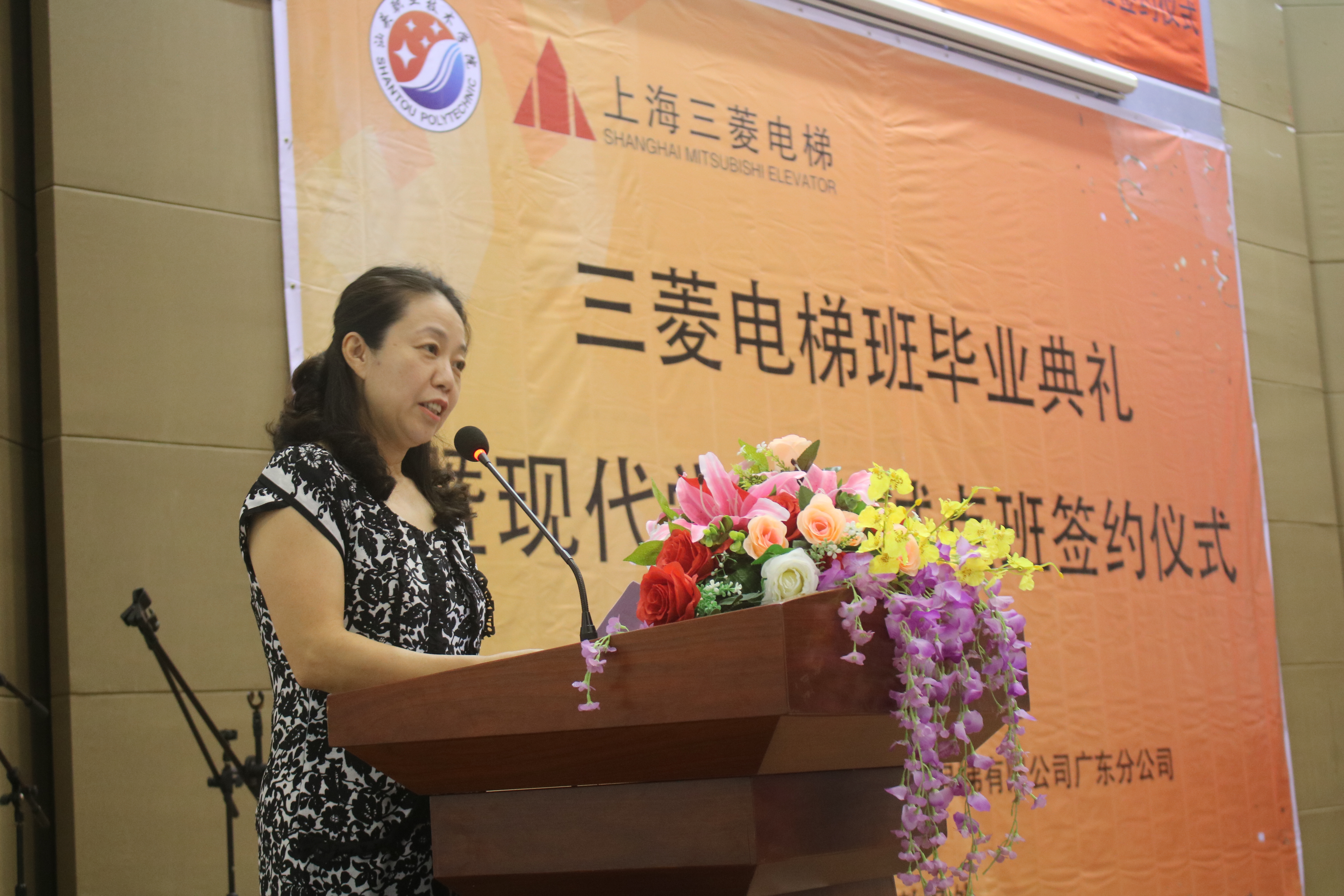 在活动现场,首先由吴萍院长致辞,她对第一届三菱电梯班学生顺利毕业,并愉快走上电梯维保的工作岗位表示衷心的祝福,对上海三菱电梯有限公司广东分公司对学院办学的鼎力支持表示衷心的感谢。吴院长指出,学院秉持“知行合一、德技双馨”校训精神,坚持“质量立校、特色兴校、创新强校、依法治校”的办学思路。从筹划开办三菱电梯班开始,学院与上海三菱电梯有限公司广东分公司一起不停地探索一种科学、高效、多方共赢的合作办学模式。为了办好“三菱电梯班”,三菱公司真诚付出:多次向学院捐赠教学设备(含水平跨度14m的扶梯)、成立三菱奖助学金、派企业员工到校与学生互动交流、派企业专家进校讲授专业课程、辅导学生全部考取电梯上岗证、接受学生到电梯实训基地岗前培训、采用师傅带教+双导师制模式开展跟岗实习和顶岗实习。学院、机电工程系也主动作为:确保学生在校两年的教学质量、培养学生对三菱公司的感情、指派指导教师到各分公司巡视学生跟岗实习情况。吴院长衷心希望今后双方在电梯工程技术共享实训平台、产业学院、企业员工培训以及产学研等方面能够进一步深入合作。