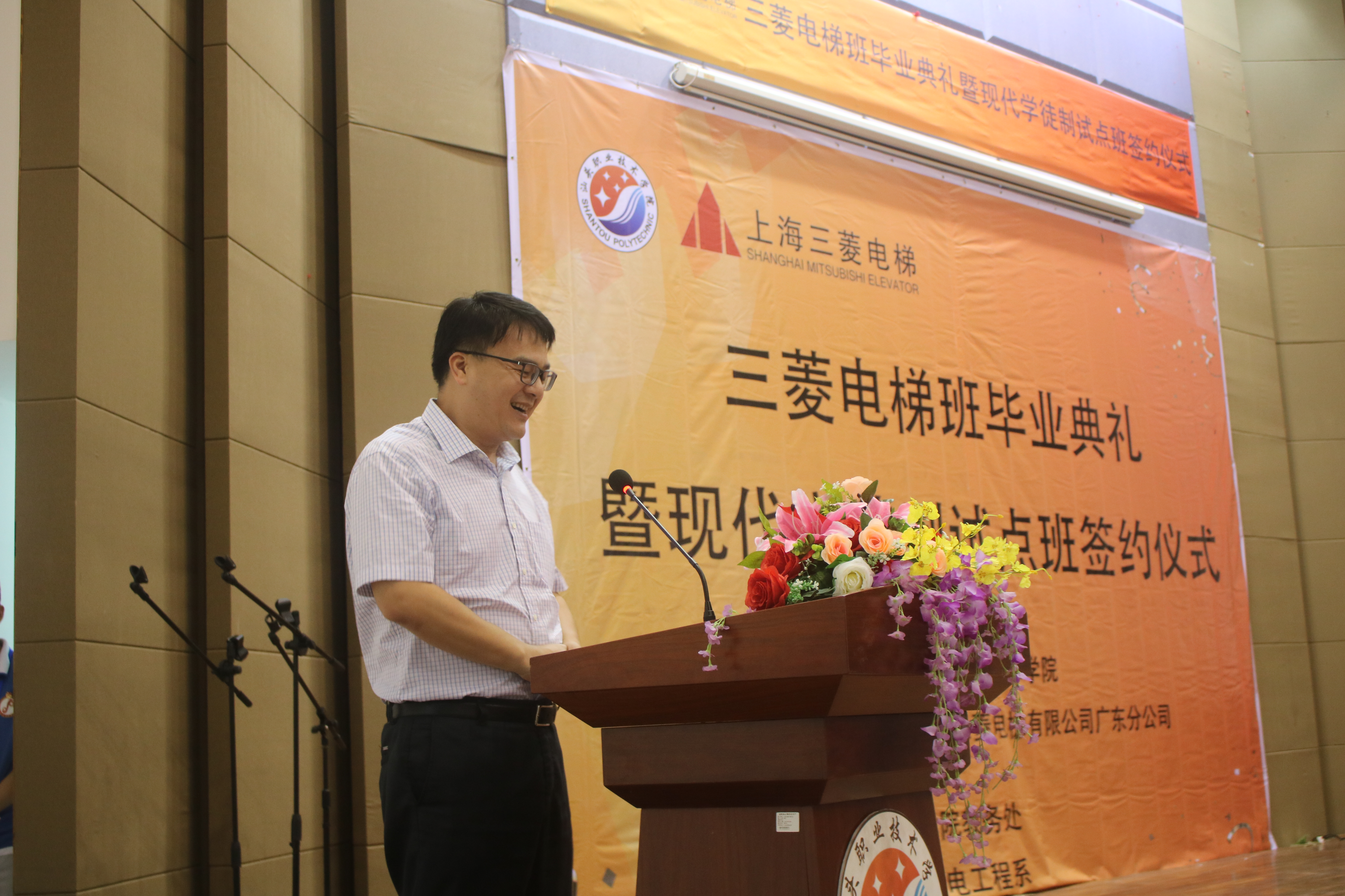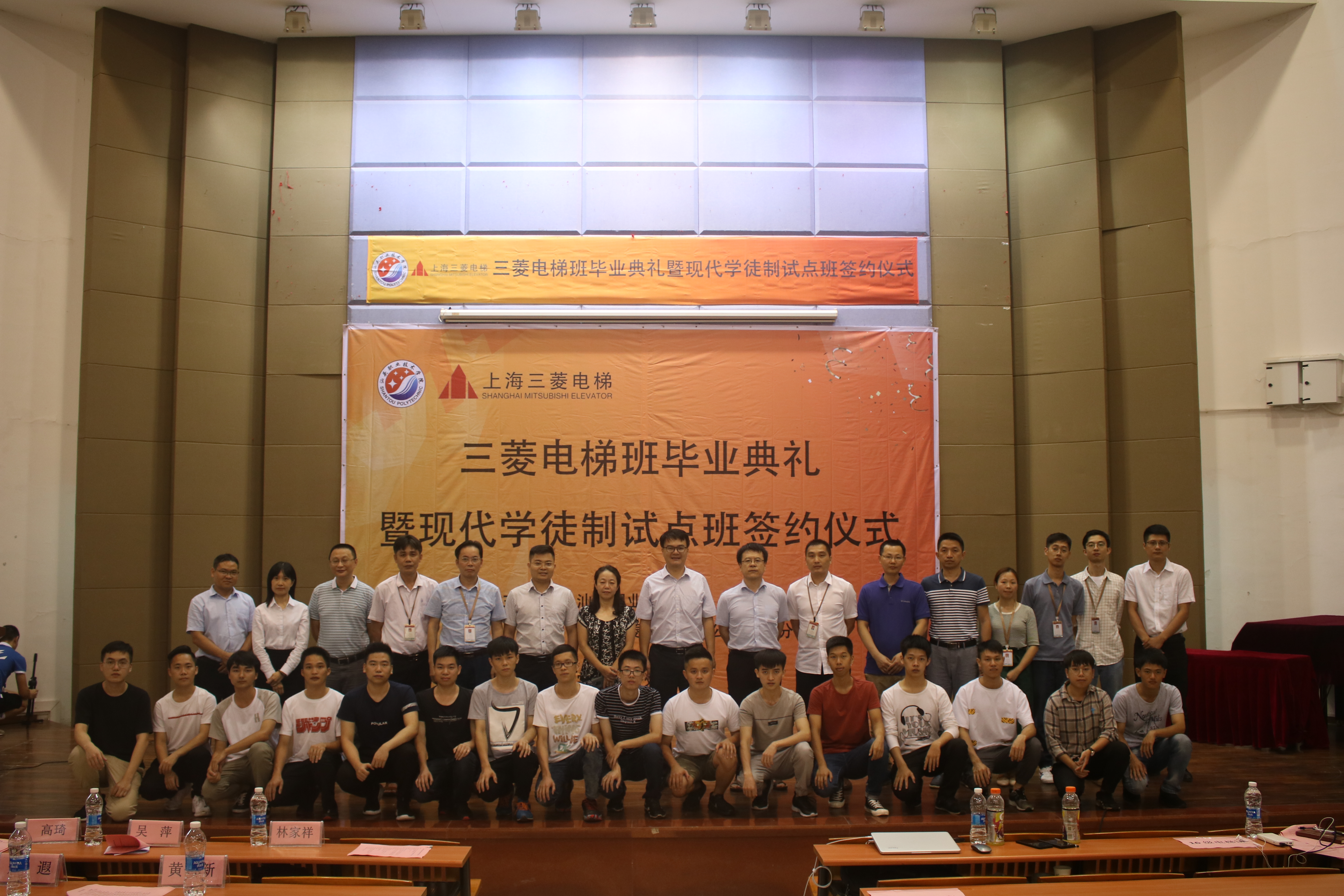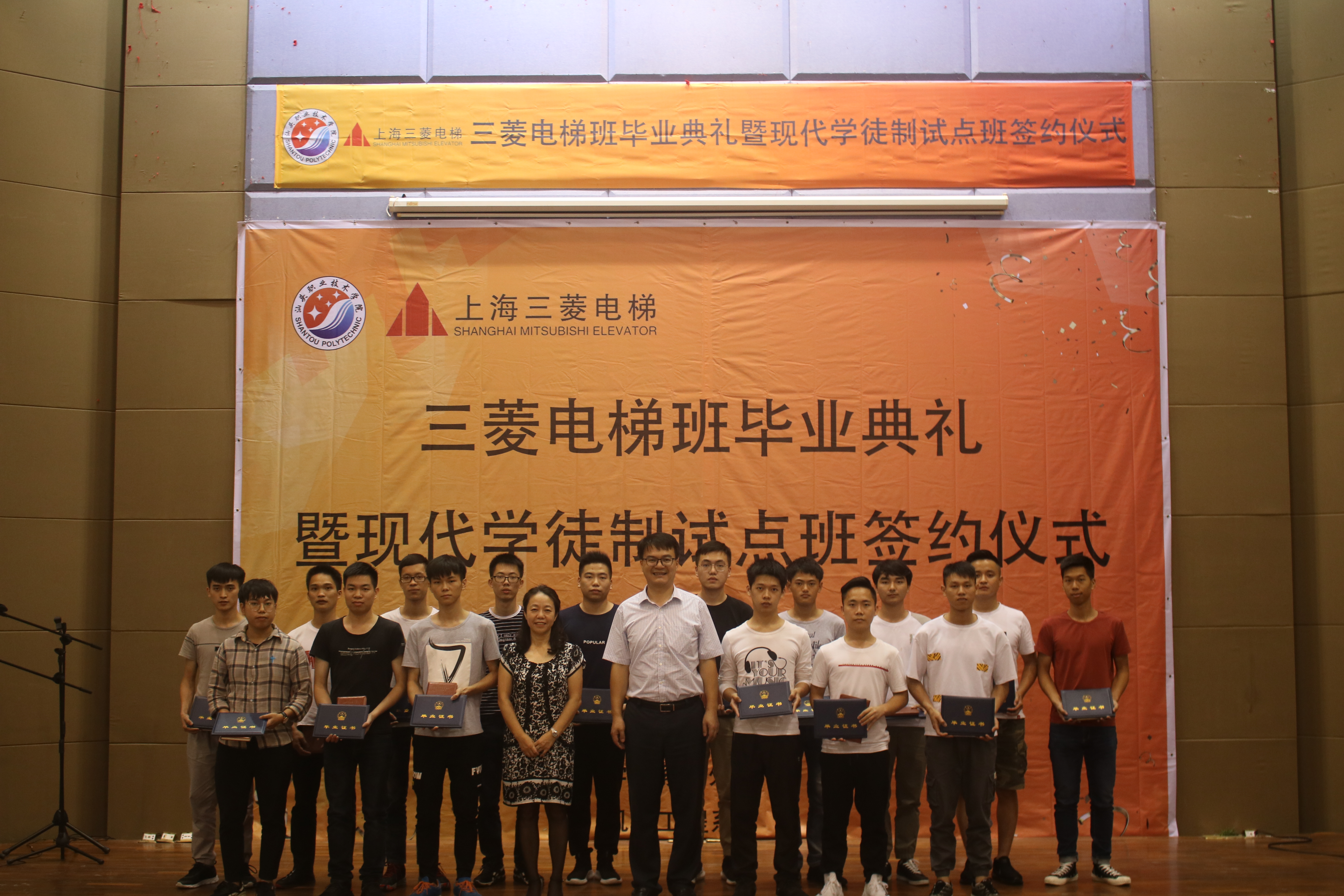 为充分展示三菱电梯班学生的精神面貌和校企合作成果,凸显学院、三菱公司对三菱电梯班的重视和关爱。6月13日下午,学院在学术报告厅举行三菱电梯班毕业典礼暨现代学徒制试点班签约仪式。上海三菱电梯有限公司广东分公司华南大区总经理高琦,上海三菱电梯有限公司汕头分公司总经理黄成志、工程部经理赵华生、综合部经理肖婷婷、维保部主管林镇水;学院院长吴萍,教务处副处长林家祥、校企合作科科长黄健新,机电工程系副主任陈明忠、系办公室主任郑遐、机械教研室主任谢志刚、三菱电梯班指导教师林惠标、方迪成出席活动;16级三菱电梯班学生代表、17级机电一体化技术专业(含17级三菱电梯班)学生、18级机电一体化技术专业(含18级三菱电梯班)学生参加活动,活动由机电工程系学生科科长曾少慧主持。