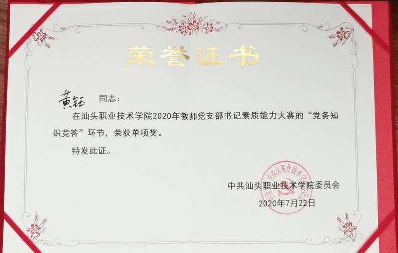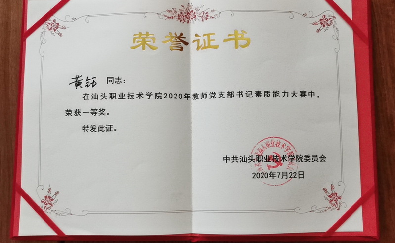 2020年7月,学院举办了教师党支部书记素质能力大赛,我系教工党支部书记黄钰同志凭着过硬的理论知识和技能,一举夺得三个奖项,分别是素质能力一等奖,“微党课”单项一等奖,“党务知识竞答”单项一等奖,她将代表我院参加广东省公办高职高专院校教师党支部书记素质能力大赛。