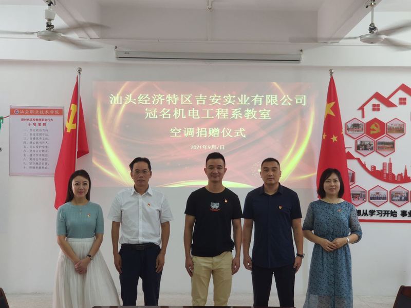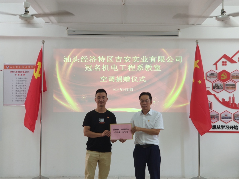 9月7日上午,汕头经济特区吉安实业有限公司教室用空调捐赠仪式在教二区D305举行,汕头经济特区吉安实业有限公司代表、机电工程系2008届校友张桂深代表汕头经济特区吉安实业有限公司向机电工程系捐赠格力空调两台,与系共建D205教室。机电工程系党总支书记、系主任陈明忠,党总支副书记郑遐、系教工支部书记黄钰、系学生支部书记陈玮苹参与了本次仪式。