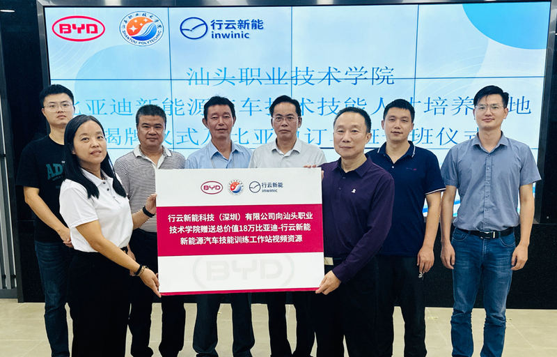1019日下午,我校先进制造学院在第三实训楼举行了“比亚迪新能源汽车技术技能人才培养基地”揭牌暨“比亚迪新能源汽车订单班”开班仪式,同时还举行了校企合作教学设备捐赠仪式。学校党委副书记、纪委书记黄少明和行云新能科技有限公司副总经理徐小红出席活动并为“比亚迪新能源汽车技术技能人才培养基地”揭牌,学校技能实训中心主任钱光健,先进制造学院党总支书记、院长陈明忠,比亚迪华南区汕头基地人事部经理曾菊生,仪式由先进制造学院党总支副书记谢瑞浩主持。