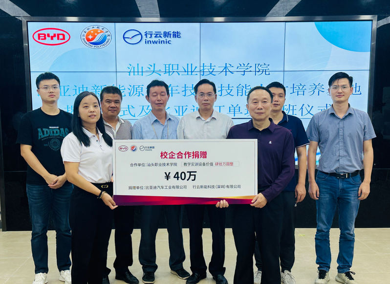会上还举行了校企合作教学设备捐赠仪式,由比亚迪汽车和行云新能公司向学校捐赠价值40万元的教学设备(包括比亚迪秦EV整车以及整车故障设置与检测连接平台等)和价值18万元的新能源汽车技能训练教学资源,用于支持订单班进行新能源汽车技术的专业学习和实践操作。
