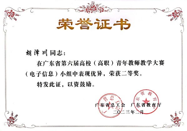 近日,由省总工会、省教育厅联合主办的广东省第六届高职青年教师教学大赛总决赛暨颁奖大会在广州工商学院三水校区举行。我系胡泽川老师荣获二等奖。