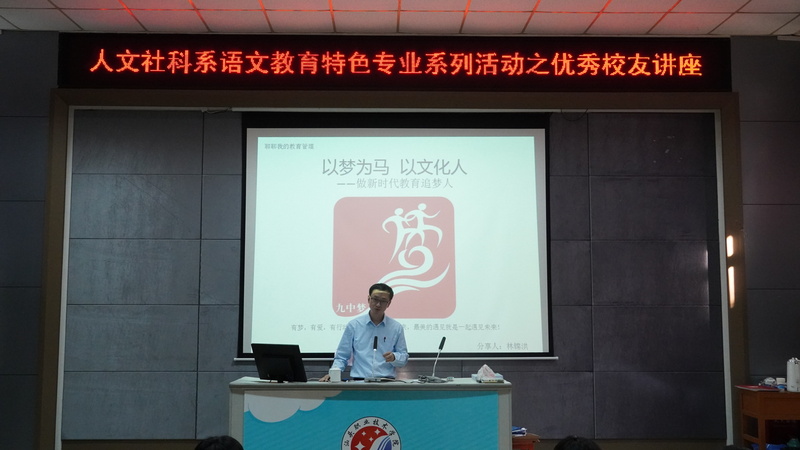 讲座特邀请的主讲人之一是汕头市第九中学校长林锦洪校友,讲座题目是《以梦为马 以文化人——做新时代教育追梦人》,林校长跟师弟师妹们分享了自己在教育工作上的心得体会,包括文化引领,诗意管理,五育并举。每个观点林校长都结合自身的工作实践来讲,既有说服力又有感染力,最后林校长以“有梦,有爱,有行动,有未来,未来已来,最美的自己就是一起遇见未来”作为结束语。
