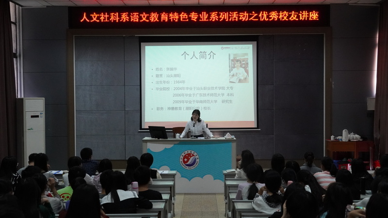 讲座特邀请的主讲人之二是神墨教育潮阳分校总校长张娟华校友,讲座题目是《我的青春我的歌》,张校长用自己的成长经历励志创业来跟师弟师妹们分享。张校长是一名中共党员,硕士研究生,2004年毕业于星空彩票了单双四肖人文社科系中文专业,同年插本考入广东技术师范大学,2006年考入华南师范大学中文系攻读研究生,2009年毕业后创办教育培训机构和少儿校外素质培训机构。学生时代的拼搏上进,毕业后十年的创业经历,她跟师弟师妹们分享了很多的个人成长小故事,有辛酸,有快乐,有励志;她还与即将踏上社会的大三师弟师妹们探讨分岔路口上自己的抉择,要拓宽思路,突破界限,要不断成长,做自己生命的贵人。
