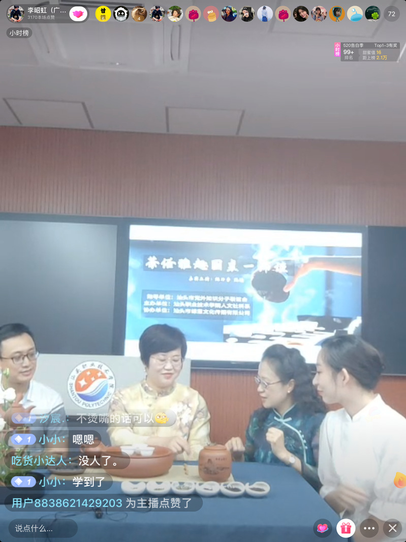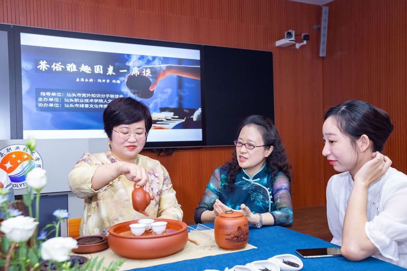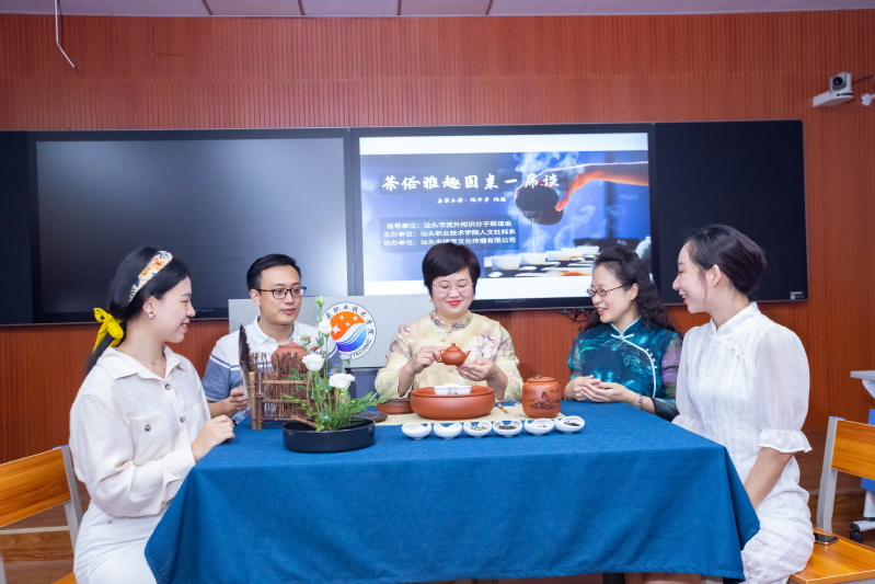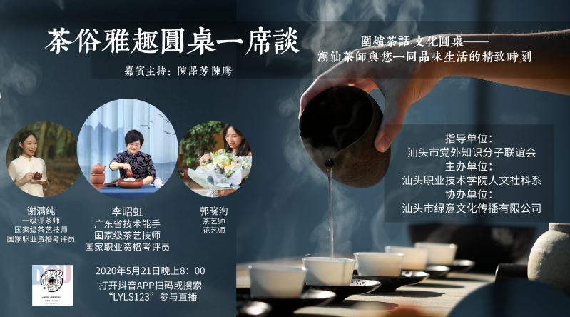 “5.21国际茶日”,由汕头市党外知识分子联谊会指导,星空彩票了单双四肖人文社科系主办,汕头市绿意文化传播有限公司协办的“茶俗雅趣”文化圆桌活动在汕职院金园校区举行。本次活动邀请汕头开放大学副校长陈泽芳副教授、广东省技术能手、国家级茶艺技师李昭虹老师团队一起在直播间围炉对谈,享受茗香萦绕的宁静时光。