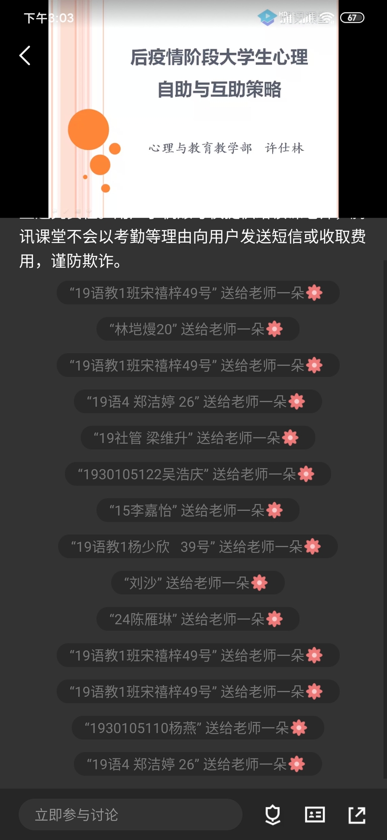 2020年6月22日,人文社科系组织全体同学,借助腾讯课堂线上平台,在线聆听由心理与教育教学部许仕林老师主讲的《后疫情阶段大学生心理自助与互助策略》心理健康教育课。