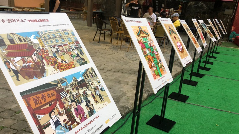 本次展览在人文社科系党总支的指导下,由语言文化传媒教研室联合学院的校企合作单位——汕头市文化创意产业协会、汕头工业设计城公开向社会征集20幅作品,集中展示了爱国侨乡汕头的饮食风俗和风土人情,巧妙融合了潮汕文化元素与插画、设计等创意元素。多种潮汕经典被囊括其中——吃喝有红桃粿、鲎粿和工夫茶等,玩乐有鮀香腊味店、小公园亭、百货大楼等。每幅作品都蕴含着创作团队对潮汕文化的理解和表达,饱含着创作团队对潮汕文化的喜欢与热爱。为完成此次布展,2018级文秘专业39名学生在李沫彦老师的带领下,与园区管理方一起完成活动策划、场地布置等工作,使同学们在布展中感受潮汕特色,品味本土文化,体验并进行文化创意活动。