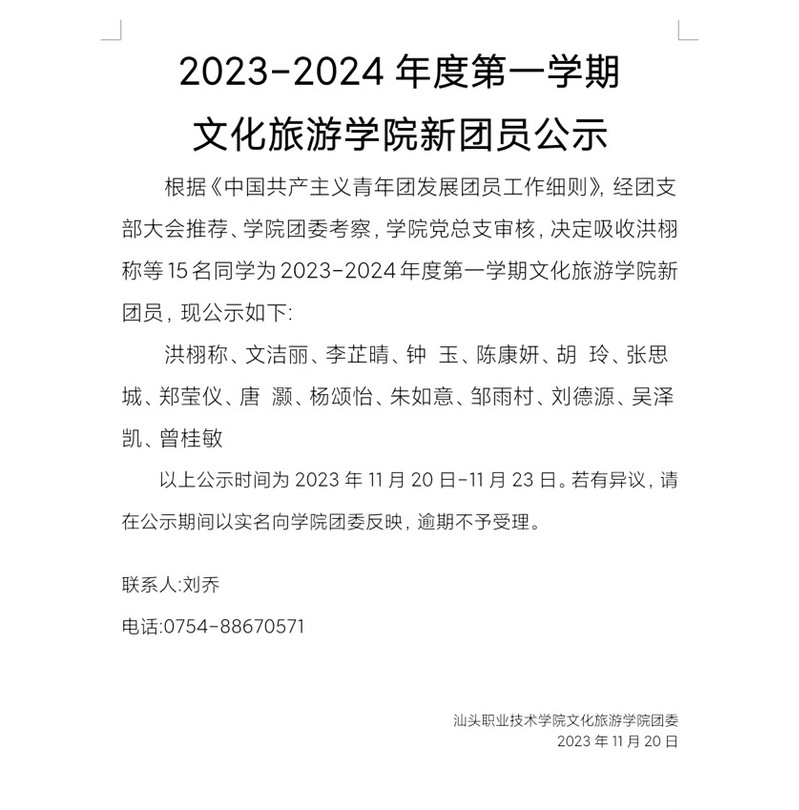 2023-2024 年度第一学期文化旅游学院新团员公示