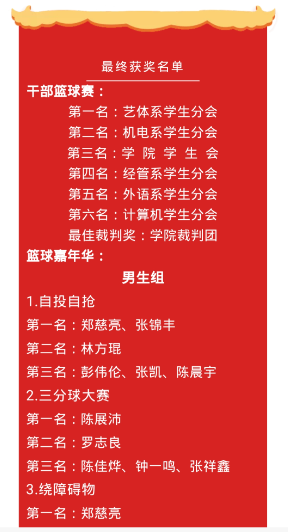 出席本次篮球赛的嘉宾分别是艺术体育系团总支郑传炫书记、刘少斌老师、章秀纯老师、刘珩老师、蔡怡楠老师。参加此次干部篮球赛的队伍包括了学院学生会、艺体系学生分会、经管系学生分会、外语系学生分会、机电系学生分会以及计算机系学生分会。