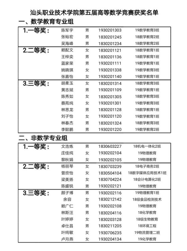 为提高创新性人才培养质量,促进我院高等数学课程的改革与建设,增加相关专业学生学习高等数学的兴趣,培养学生分析解决问题的能力,为我院学生提供一个展示基础知识和思维能力的舞台,同时也为选拔优秀学生参加我省第十届数学竞赛,经过近两个月的精心准备,6月18日下午,由学院技能实训中心举办,自然科学系承办的学院第五届线上“高等数学”竞赛顺利进行。此次大赛面向全院学生,学生自愿报名参赛,共报名参赛学生人数 81人。比赛采用单人闭卷竞赛方式,依照我省高等数学竞赛民办高职类竞赛大纲要求,竞赛内容以一元函数微积分为主,与我院《高等数学》、《数学分析》课程相结合。赛后,根据竞赛试卷评阅结果及竞赛方案,数学专业组16人获奖,非数学专业组15人获奖,获奖名单附后。