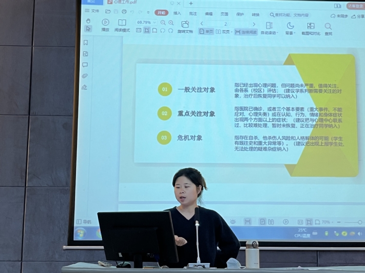 郭慧敏科长首先通报了我系疫情防控工作落实情况,传达了疫情防控的最新要求,强调“非必要不离汕”、“离汕申请报批”、“返汕核酸查验”等多项原则务必落到实处。会上强调日常考勤问题,要求值班老师严格课堂考勤及夜自修巡查,做到缺勤人员“知原因,明去向”。自然科学系二级心理辅导站站长王雪丹向各位辅导员简述了学生心理危机分级标准与相应的干预程序,重点关注学生心理健康。自然科学系党总支专职副书记李婕指出要加强宣传引导,关注学生诉求,营造积极团结的舆论氛围。